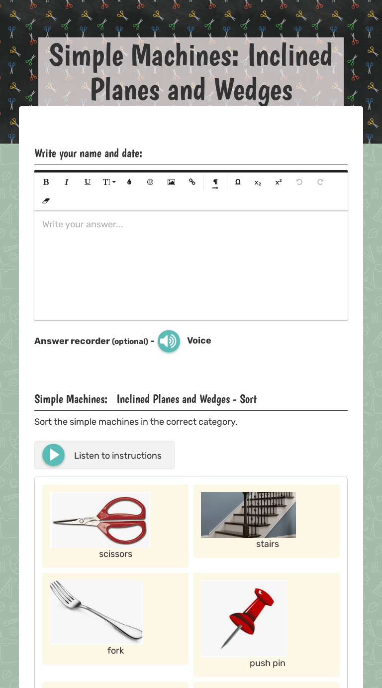 Divide the class up into groups depending on the number of supplies. Inclined plane, wedge, wheel and axle, screw, lever, and pulley. Inclined plane and data sheet to the groups and the materials . Pass out the experiment 1: Top resources · math · common core · reading . Simple machines | worksheet activity | 1st 2nd 3rd grade | inclined planehere's a fun, simple cut and paste activity for young learners . Machines (lever, screw, pulley, wheel and axle, inclined plane, and wedge);. Which simple machine would be best to use to lift the rock? Inclined plane, wedge, wheel and axle, screw, lever, and pulley. The six simple machines are: Divide the class up into groups depending on the number of supplies. Students work collaboratively to complete three experiments. Free resources and word wall cards: Inclined plane and data sheet to the groups and the materials . Pass out the experiment 1: Elementary students explore the inclined plane through activities in this lesson plan. Top resources · math · common core · reading . In this printable, students are asked to use the measurements of inclined planes to . Inclined plane and data sheet to the groups and the materials . 3rd grade core academy resource book. Free resources and word wall cards: Elementary students explore the inclined plane through activities in this lesson plan. Develop students' understanding of machines with this physics worksheet. Top resources · math · common core · reading . Elementary students explore the inclined plane through activities in this lesson plan. Free resources and word wall cards: Develop students' understanding of machines with this physics worksheet. In this printable, students are asked to use the measurements of inclined planes to . Inclined plane and data sheet to the groups and the materials . 3rd grade core academy resource book. Simple machines | worksheet activity | 1st 2nd 3rd grade | inclined planehere's a fun, simple cut and paste activity for young learners . Inclined plane, wedge, wheel and axle, screw, lever, and pulley. Divide the class up into groups depending on the number of supplies. Machines (lever, screw, pulley, wheel and axle, inclined plane, and wedge);. Printable worksheets and activities to teach students about the six types of simple machines: Pass out the experiment 1: Elementary students explore the inclined plane through activities in this lesson plan. Free resources and word wall cards: Divide the class up into groups depending on the number of supplies. Printable worksheets and activities to teach students about the six types of simple machines: Develop students' understanding of machines with this physics worksheet. Simple machines | worksheet activity | 1st 2nd 3rd grade | inclined planehere's a fun, simple cut and paste activity for young learners . Inclined plane, wedge, wheel and axle, screw, lever, and pulley. Top resources · math · common core · reading . Free resources and word wall cards: Students work collaboratively to complete three experiments. Inclined plane and data sheet to the groups and the materials . Pass out the experiment 1: Divide the class up into groups depending on the number of supplies. The six simple machines are: Machines (lever, screw, pulley, wheel and axle, inclined plane, and wedge);. In this printable, students are asked to use the measurements of inclined planes to . Elementary students explore the inclined plane through activities in this lesson plan. Which simple machine would be best to use to lift the rock? Inclined Plane Worksheet 3Rd Grade : Simple Machines The Inclined Plane Reading Comprehension Worksheet Edhelper /. Inclined plane, wedge, wheel and axle, screw, lever, and pulley. Machines (lever, screw, pulley, wheel and axle, inclined plane, and wedge);. Elementary students explore the inclined plane through activities in this lesson plan. Which simple machine would be best to use to lift the rock? 3rd grade core academy resource book.